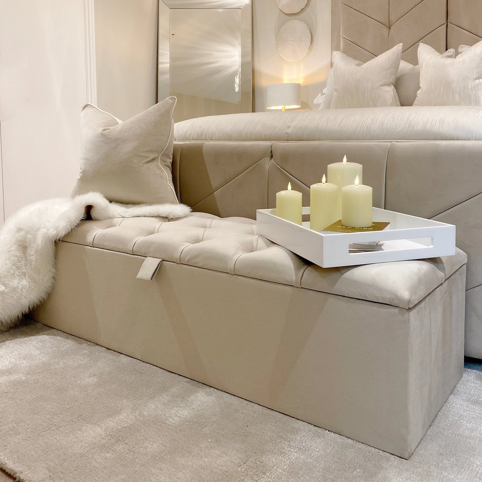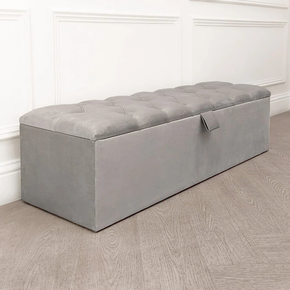 Upholstered in a neutral vanilla cream, glam grey toned , neutral pebble toned velvet fabric, and finished in a luxurious buttoned design, the Belvoir Buttoned Ottoman Box allows you to add some extra storage space to your room in style.
